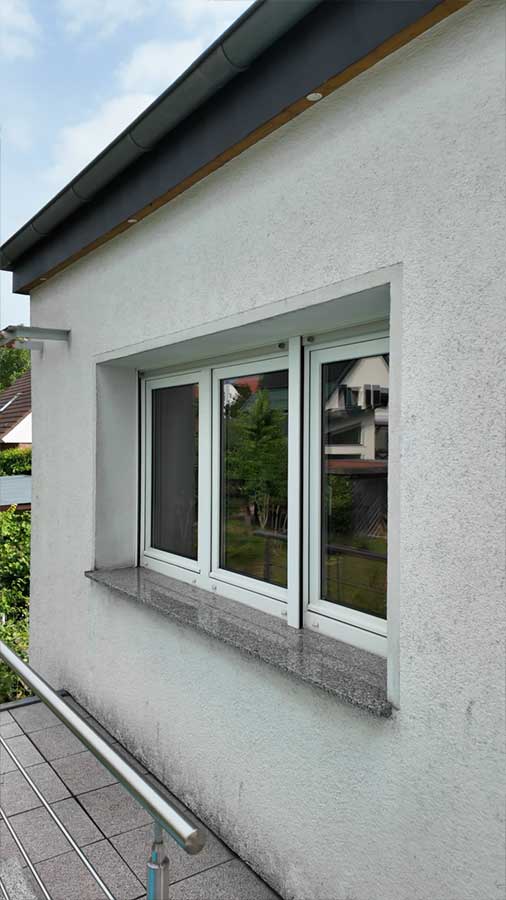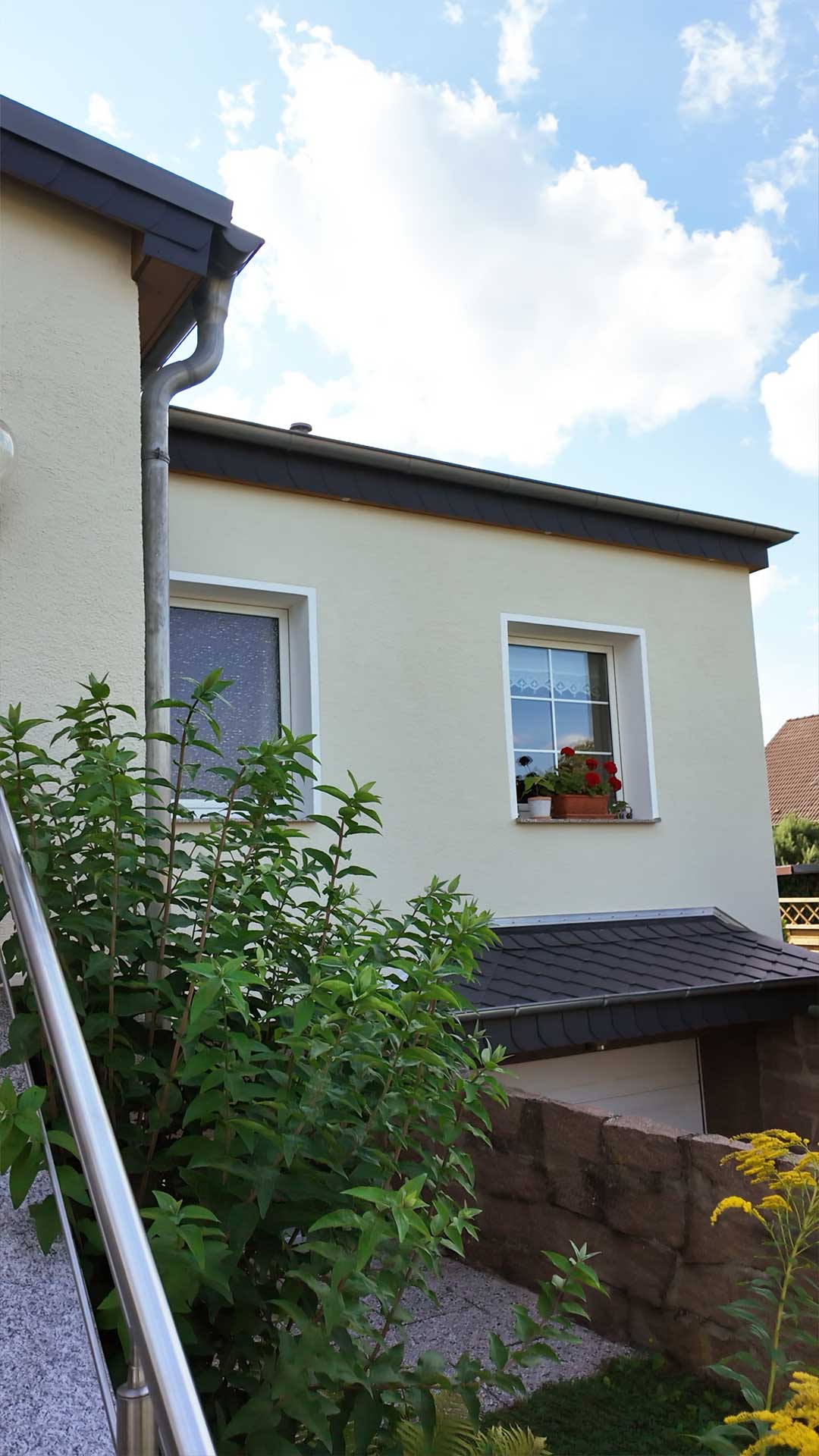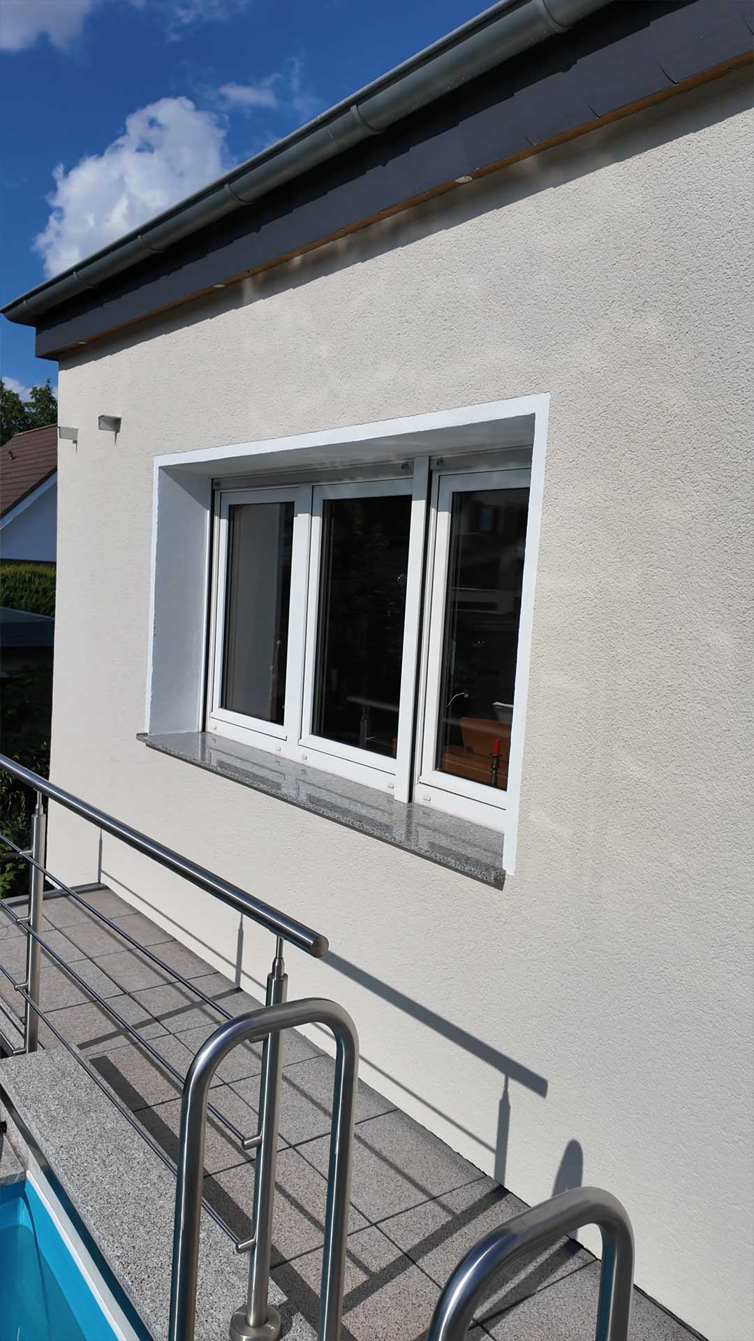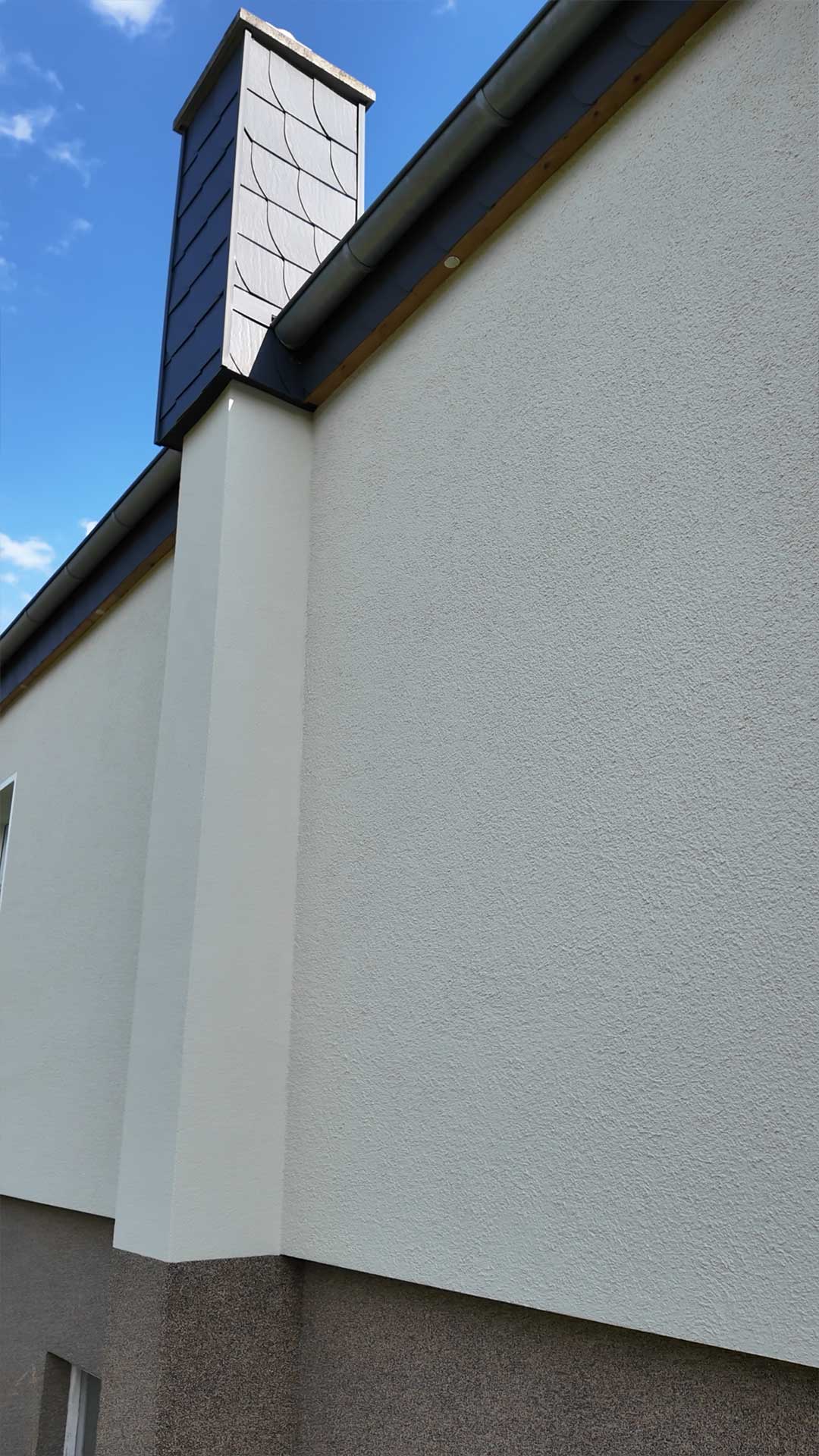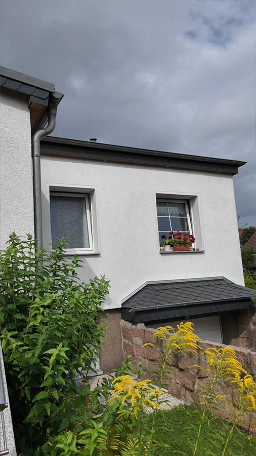Zuerst erfolgte die Prüfung des Putzes und die Reparatur der schadhaften Stellen. Im Anschluss wurde die Fassade mit einer faserverstärkten Fassadenfarbe (Silikat) gestrichen. Nach Trocknung wurde die Fassde noch zwei Mal mit Silikat Farbe gestrichen, die Leibungen und Faschen haben wir abgesetzt.